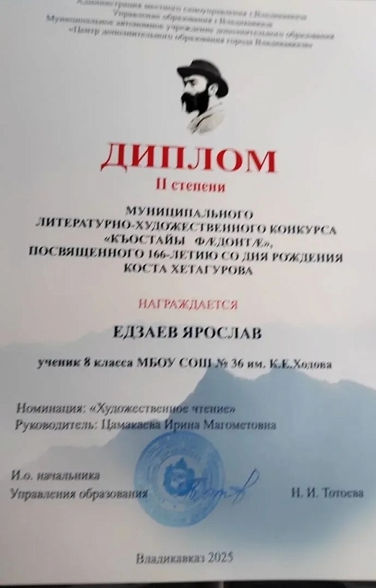 В муниципальном литературно-художественном конкурсе "Къостайы фæдонтæ", посвящённом 166-летию со дня рождения Коста Хетагурова, ученик 8 "А" класса Едзаев Ярослав занял 2 место.